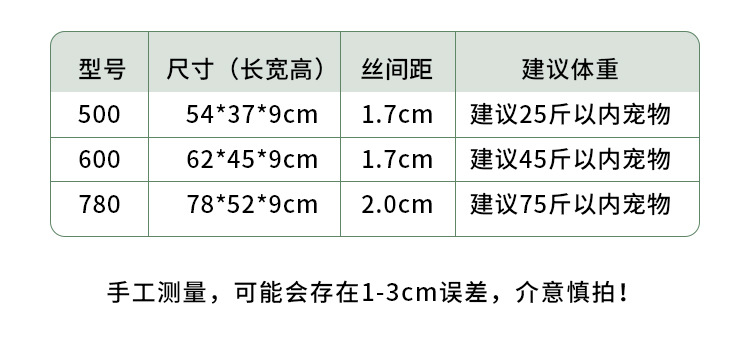 | サイズ | 寸法(長×幅×高)(cm) | 隙間距離(cm) | 推奨体重(kg) |